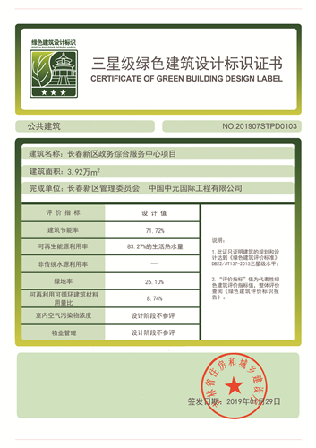 获奖情况:获吉林省住房和城乡建设厅颁发的三星级绿色建筑设计标识证书